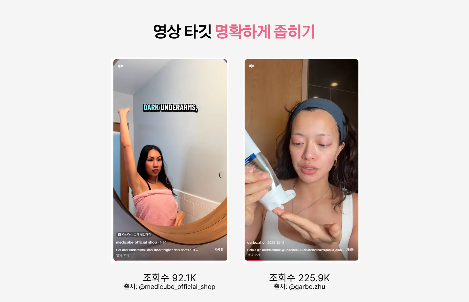 조회수가 높았던 콘텐츠 중엔 '겨울철에 피부가 건조해지기 쉽잖아요'보다는 '겨울철에 입술 각질 많이 일어나는 사람만 보세요', '주름이 슬슬 고민되는 20대 후반만 보세요'처럼 구체적인 대상을 앞단에 지목하는 콘텐츠들도 있었습니다. 타깃을 명확하게 콕 찍어 부르는 순간 '이건 내 얘기잖아'라며 경계심을 해제하고 영상에 몰입하게 되기 때문입니다.