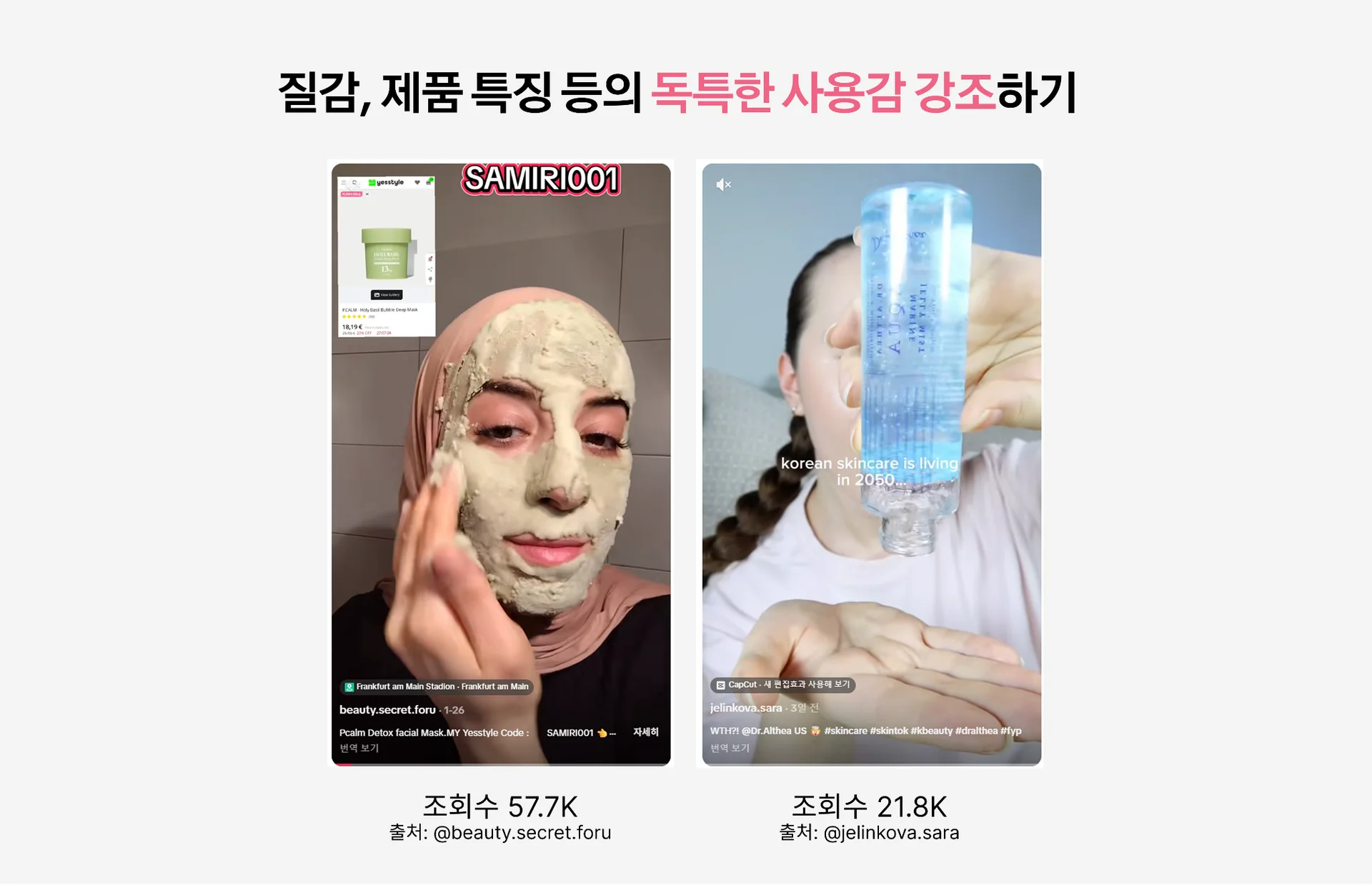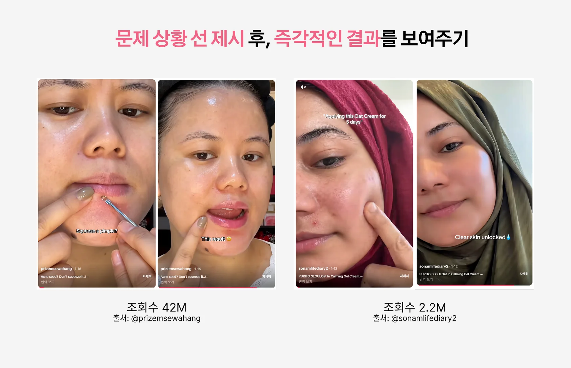 익숙하지 않은 마이크로 인플루언서가 피드에 뜨는 경우, 무의식중에 '이 영상이 내게 무엇을 해결해 줄 것인가'를 기준으로 시청 여부를 판단하는 경우가 많습니다. 따라서 영상 시작과 동시에 특정 문제 상황을 제시하고, 그 해결책으로서 제품 사용의 ‘즉각적인’ 결과를 보여주는 구조가 조회수에 효과적이었습니다.