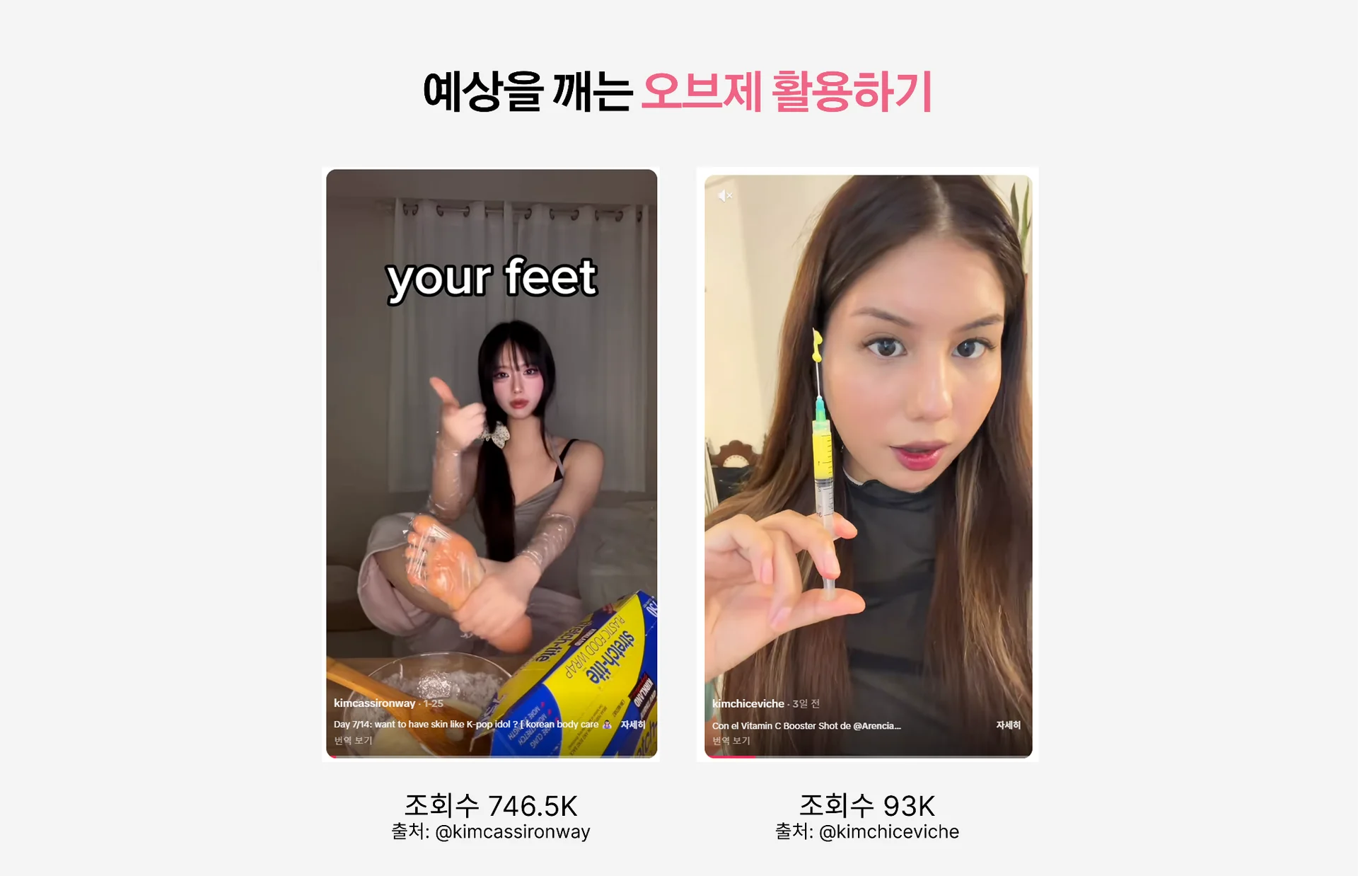 뷰티 신에서 흔히 볼 수 없는 이질적인 오브제를 활용하는 콘텐츠도 눈에 띄었습니다. 1월 동안엔 주사기, 주걱, 얼음, 젤리 등의 오브제가 포착되었어요. 이런 이질적 조합은 본능적으로 '이게 뭐지?'라는 호기심을 유발하고, 그 짧은 순간이 스크롤을 멈추게 만듭니다.